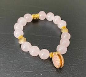 Beautiful Rose Quartz 10mm beads meet in the middle to frame two matching Pink Enamel dangling Scallop Shells creating sparkle and interest. Two small gold tone alloy Scallop Shells further enhance this bracelet’s pastel radiance.